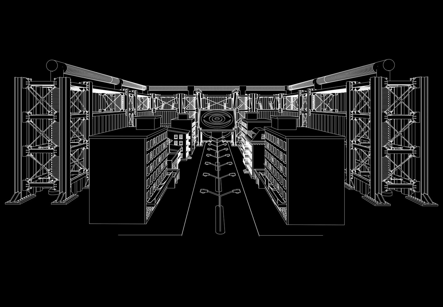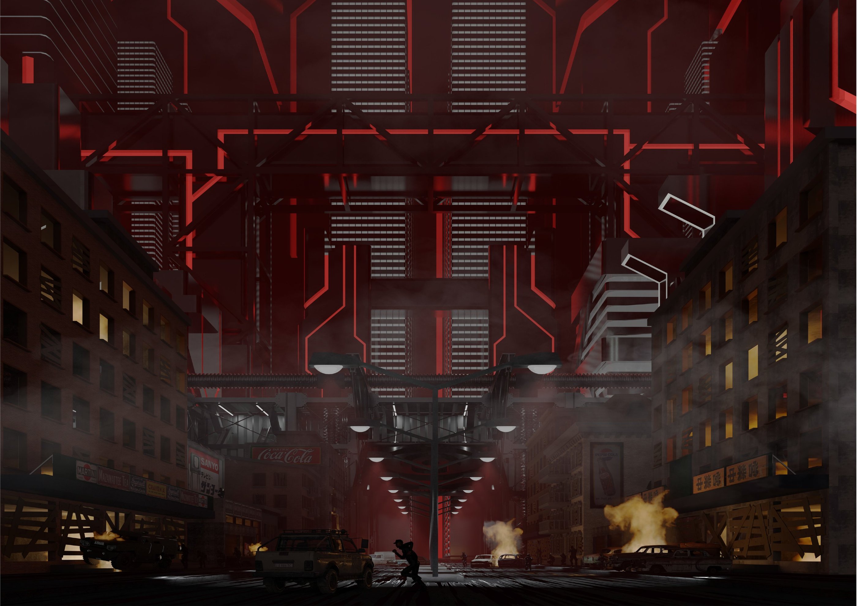 Im Wahlfach „Blender“ wurde den Studierenden die Animation und Render-Software Blender nahegebracht. Blender ist ein sehr komplexes 3D-Modellierungsprogramm, das dem Anwender unglaublich viele Möglichkeiten bietet, seine Ideen zu visualisieren. Da Blender eine sehr offene Software ist, lässt es sich mit vielen anderen Programmen kombinieren und erweitern. In der Architekturvisualisierung ist Blender aufgrund seiner hohen Komplexität noch nicht weit verbreitet und wird nur wenig genutzt. Es ist jedoch bei Spieleentwicklern und Digitalkünstlern sehr beliebt. Die Studierenden sollten sich ein utopisches oder dystopisches Szenario in der Zukunft ausdenken und visualisieren. Ich entschied mich für eine dystopische Zukunft mit einer Zweiklassengesellschaft und einer gigantischen Megacity auf den Ruinen unserer heutigen Städte. Im Vordergrund meiner Arbeit stehen die Überreste einer typischen amerikanischen Stadt wie New York oder Boston..