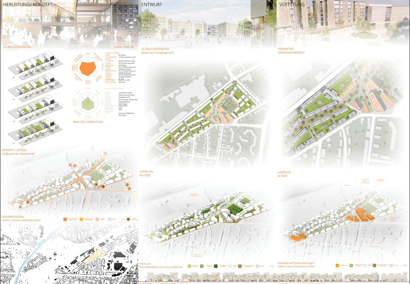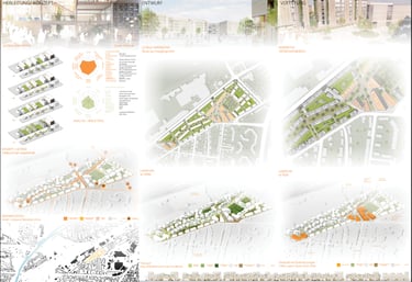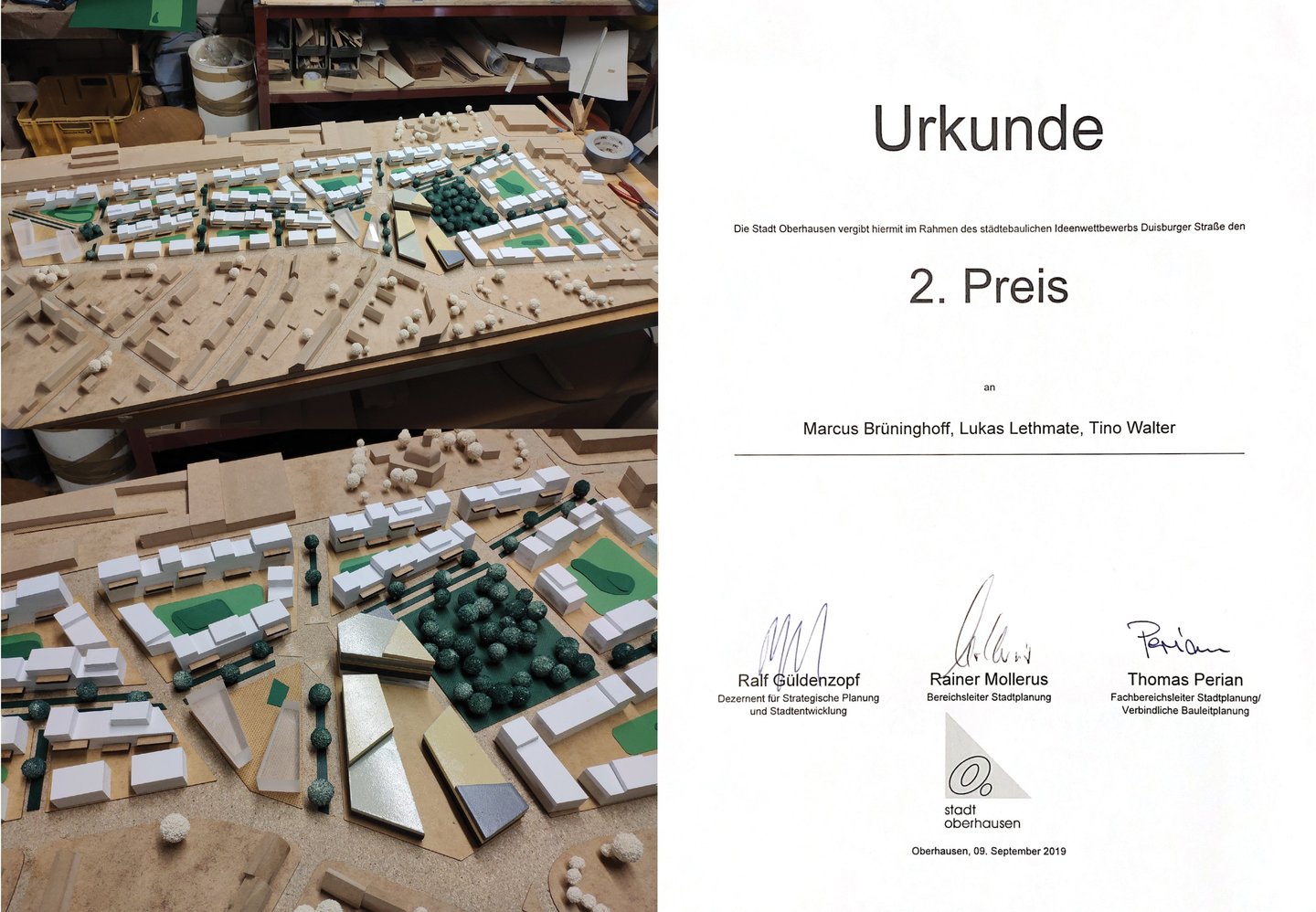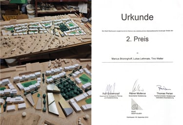 Das Modul illustriert die Entwicklung städtebaulicher Leitbilder und deren Einfluss auf unsere gegenwärtigen Städte. Es werden aktuelle Ziele des städtebaulichen Entwerfens besprochen. Anhand konkreter städtebaulicher Aufgaben werden diese Inhalte in Form von Entwürfen und einem Bebauungsplanentwurf angewendet. In der Regel erfolgen diese Aufgaben in Abstimmung mit Städten und Gemeinden. Im Modul Städtebau 2 bestand die Endaufgabe in einem Studentenwettbewerb der Stadt Oberhausen. Ziel war es, ein Quartier in Oberhausen-Lirich mit einer Fläche von … Quadratmetern umzugestalten. Diese Aufgabe wurde in Gruppen von drei Studierenden bearbeitet. Meine Gruppe entschied sich für eine weitgehend autofreie Planung mit zwei Achsen als Hauptverkehrsadern, die ausschließlich zu Fuß und per Rad genutzt werden sollen. Bei der Bebauung wählten wir eine Mischform aus Reihenbebauung und einzelnen Punktbebauungen, die viele kleine, geschützte Höfe bilden und den Anwohnern Rückzugsorte bieten. Im Zentrum, an der Kreuzung der beiden Achsen, positionierten wir eine Quartiersmitte mit Kulturzentrum, Kindergarten, Gemeindezentrum und Gastronomie. An der südlichen Spitze ist eine Grundschule vorgesehen.