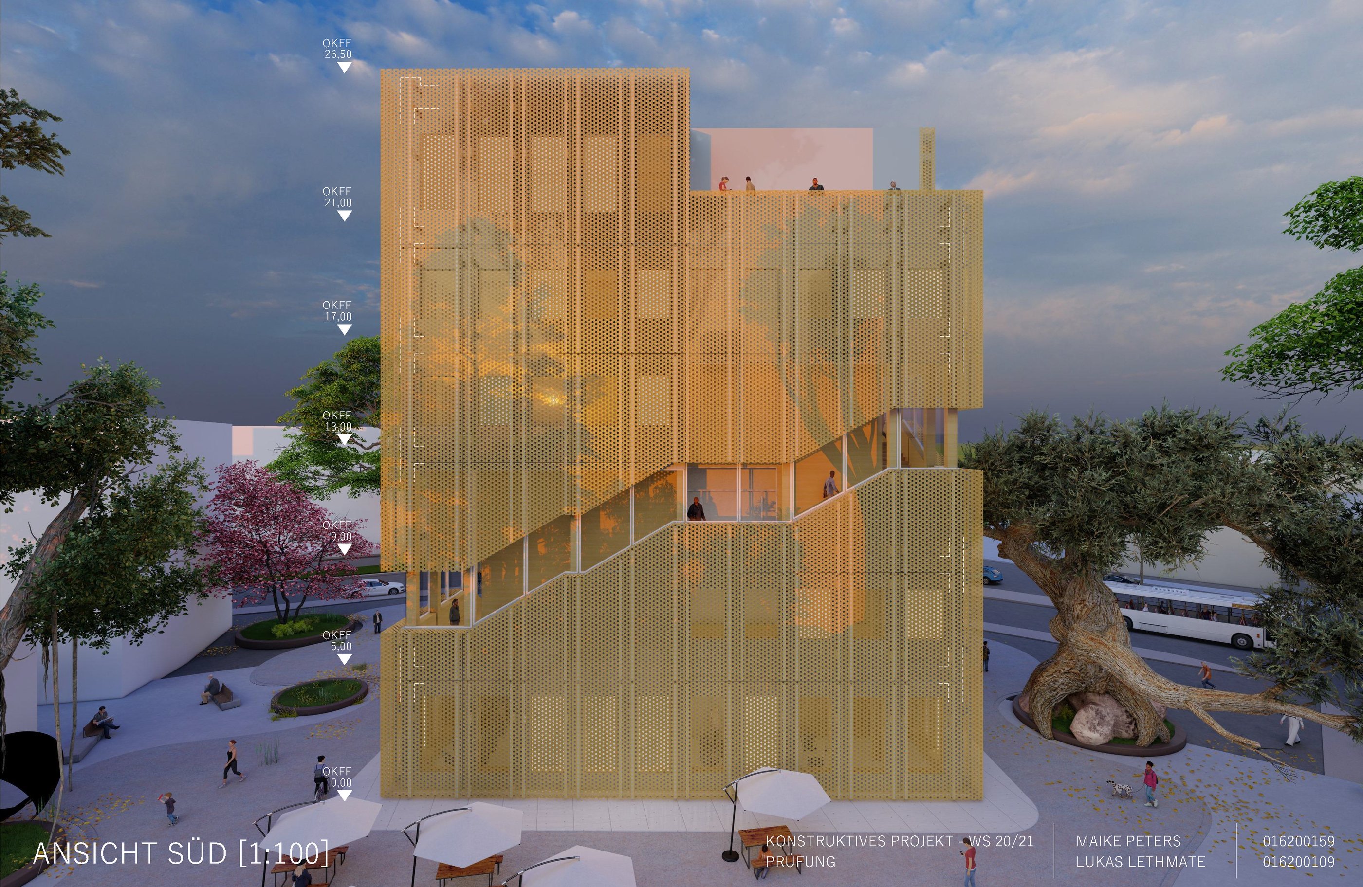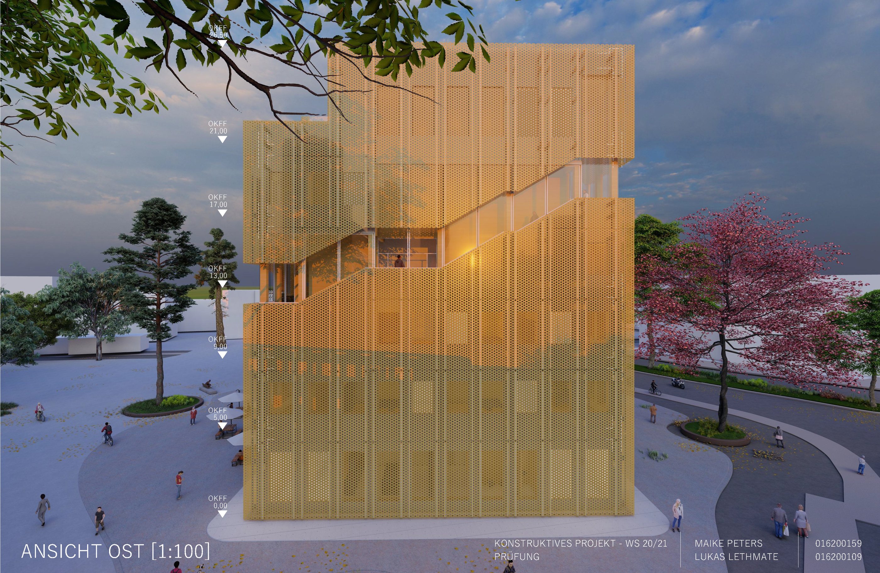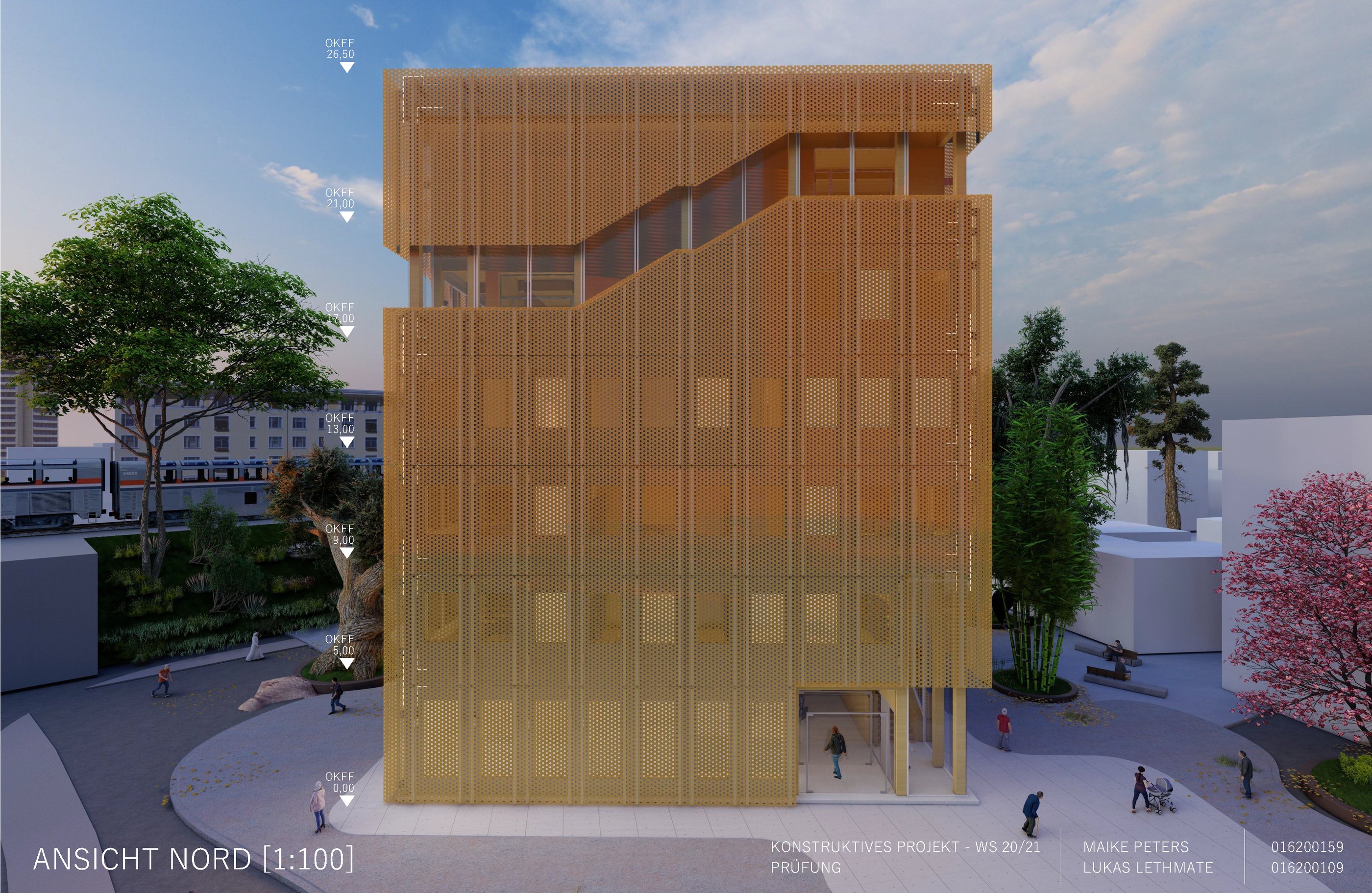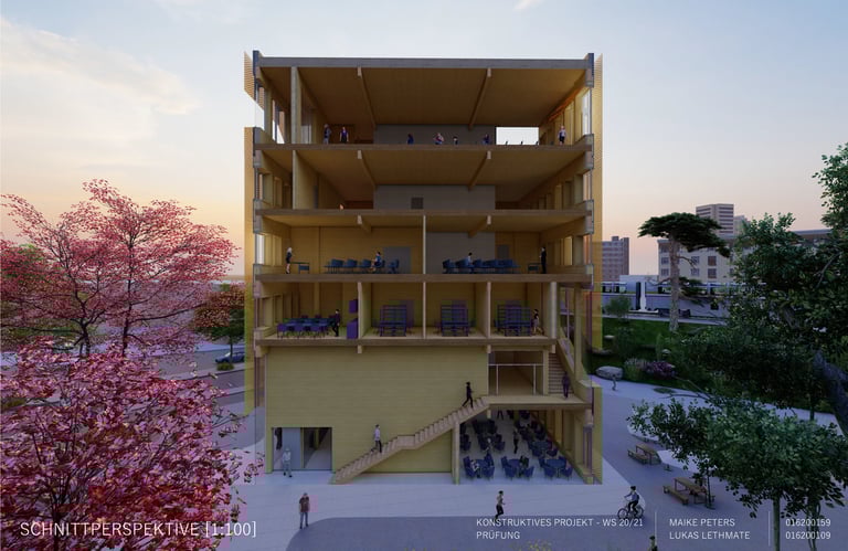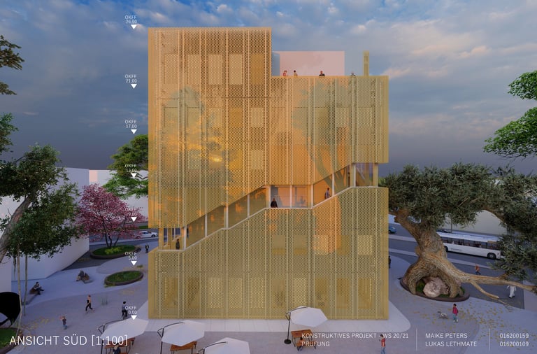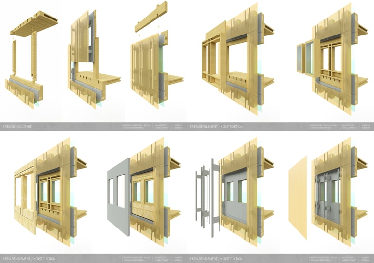 Die Aufgabe besteht darin, einen eigenen Entwurf oder wesentliche Teile davon bis zur Ausführungsreife und Detailplanung so praxisnah wie möglich auszuarbeiten. Mitbetreut wird das Projekt von den Lehrgebieten Tragwerkslehre und Baukonstruktion sowie den Lehrgebieten Technische Gebäudeausrüstung, Bauphysik, Baumanagement und Kosten im Hochbau. Auch diese Aufgabe wird in Zweierteams bearbeitet. Meine Gruppenpartnerin und ich entschieden uns für ein sechs geschossiges Hochhaus, das größtenteils aus dem Werkstoff Holz besteht und den Passivhausstandard erfüllt. Besonders wichtig war uns hierbei die weitreichende Vorfertigung im Werk unter idealen Bedingungen, um den Bauablauf zu erleichtern und zu beschleunigen. Die Fertigteile der Fassade, Treppen sowie Decken können auf der Baustelle über Steckverbindungen, die sich der klassischen Zimmermannskunst bedienen, gefügt werden. Lediglich der zentrale Fluchtkern ist aus Ortbeton gefertigt. Die Fassadenbekleidung besteht aus gelochten Messingblechen, die einen hohen Wiedererkennungswert aufweisen und zugleich Sonnenschutz gewährleisten sowie eine besondere Form der Transparenz erzeugen.