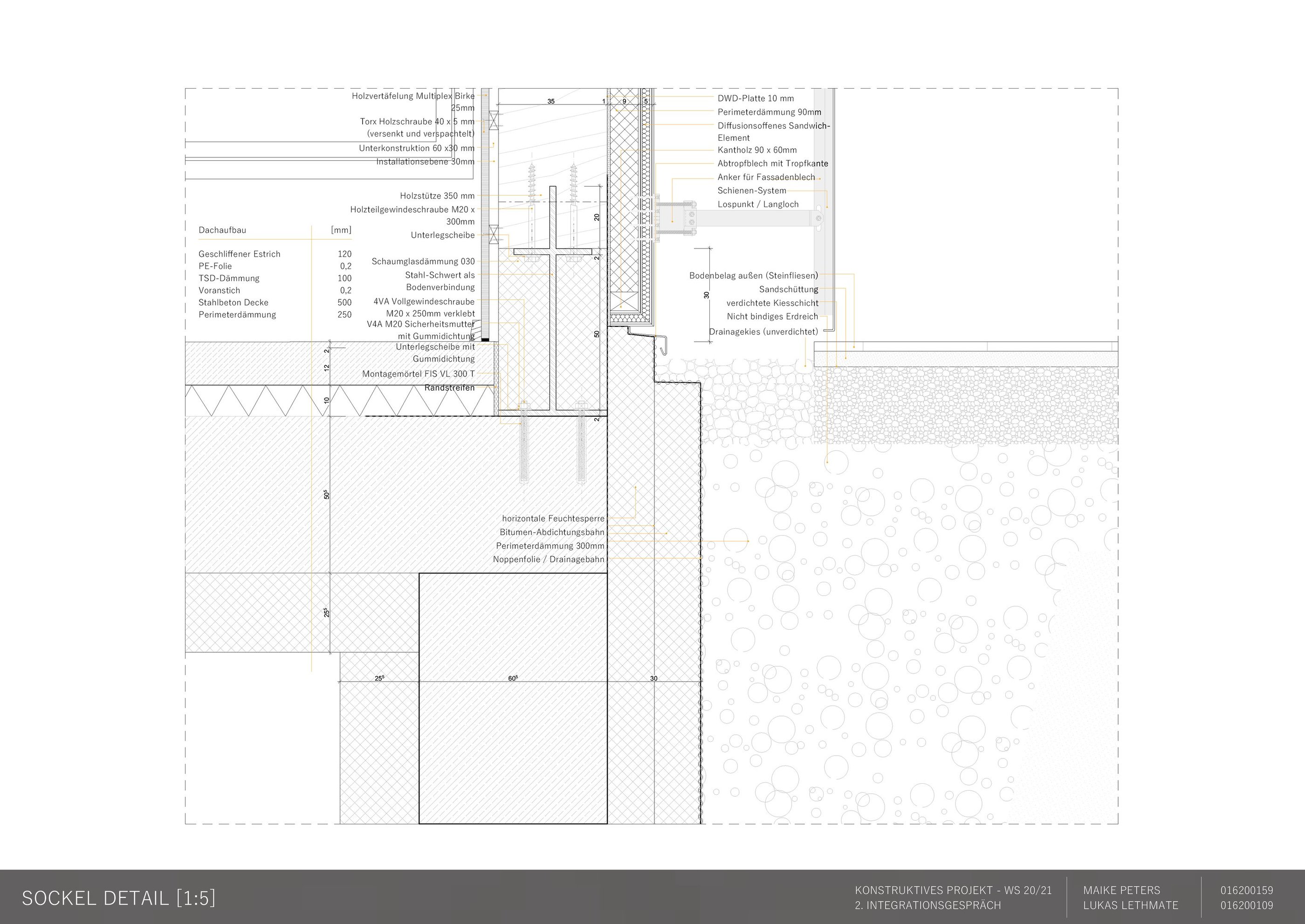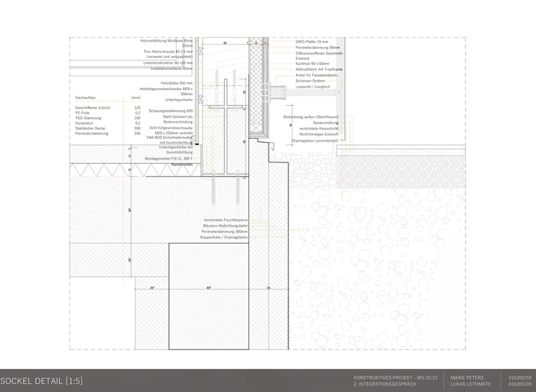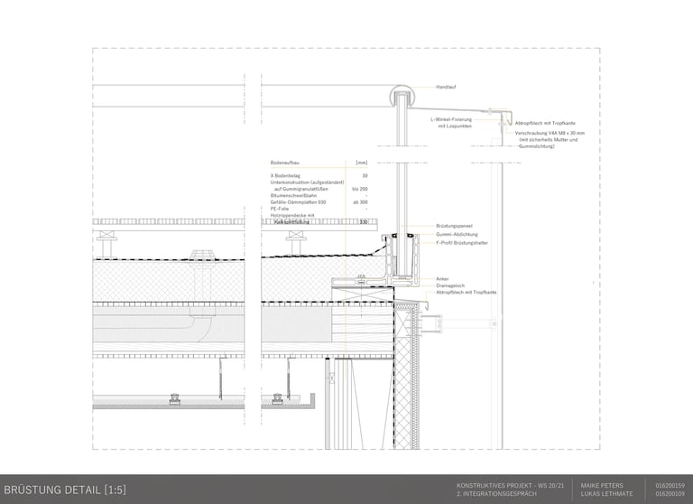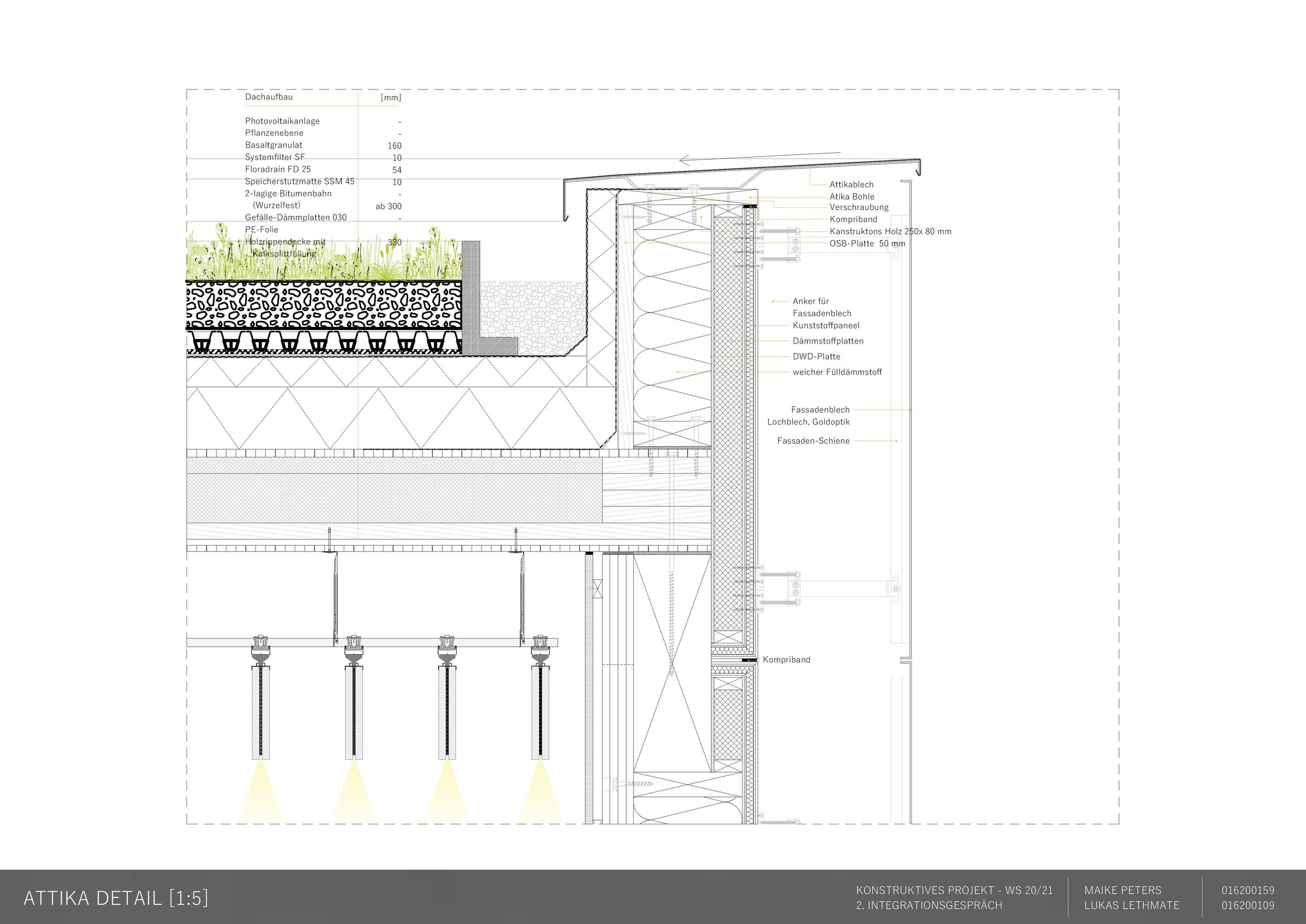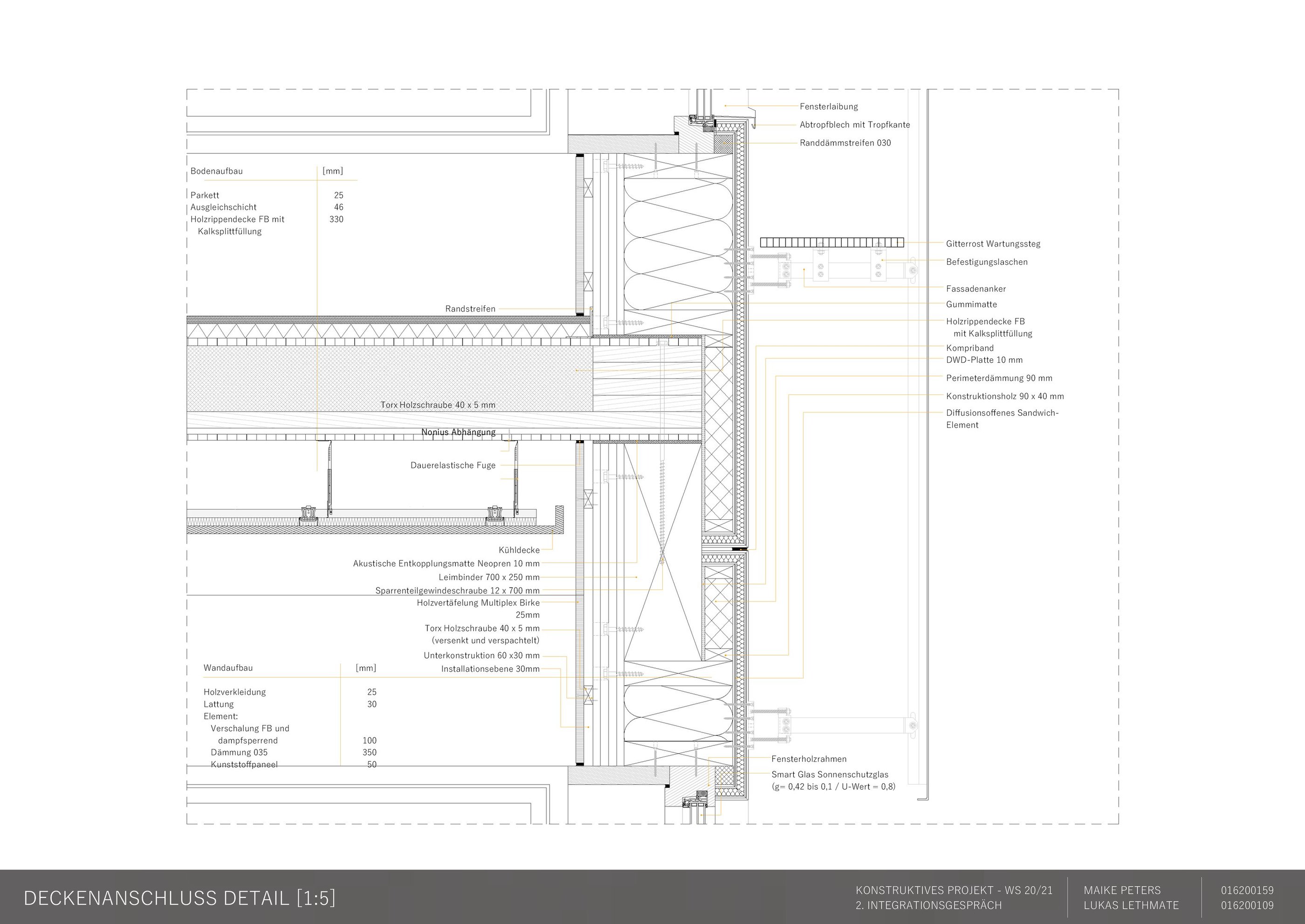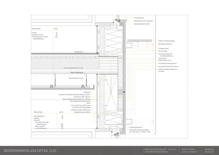 Die Aufgabe besteht darin, einen eigenen Entwurf oder wesentliche Teile davon bis zur Ausführungsreife und Detailplanung so praxisnah wie möglich auszuarbeiten. Mitbetreut wird das Projekt von den Lehrgebieten Tragwerkslehre und Baukonstruktion sowie den Lehrgebieten Technische Gebäudeausrüstung, Bauphysik, Baumanagement und Kosten im Hochbau. Auch diese Aufgabe wird in Zweierteams bearbeitet. Meine Gruppenpartnerin und ich entschieden uns für ein sechs geschossiges Hochhaus, das größtenteils aus dem Werkstoff Holz besteht und den Passivhausstandard erfüllt. Besonders wichtig war uns hierbei die weitreichende Vorfertigung im Werk unter idealen Bedingungen, um den Bauablauf zu erleichtern und zu beschleunigen. Die Fertigteile der Fassade, Treppen sowie Decken können auf der Baustelle über Steckverbindungen, die sich der klassischen Zimmermannskunst bedienen, gefügt werden. Lediglich der zentrale Fluchtkern ist aus Ortbeton gefertigt. Die Fassadenbekleidung besteht aus gelochten Messingblechen, die einen hohen Wiedererkennungswert aufweisen und zugleich Sonnenschutz gewährleisten sowie eine besondere Form der Transparenz erzeugen.