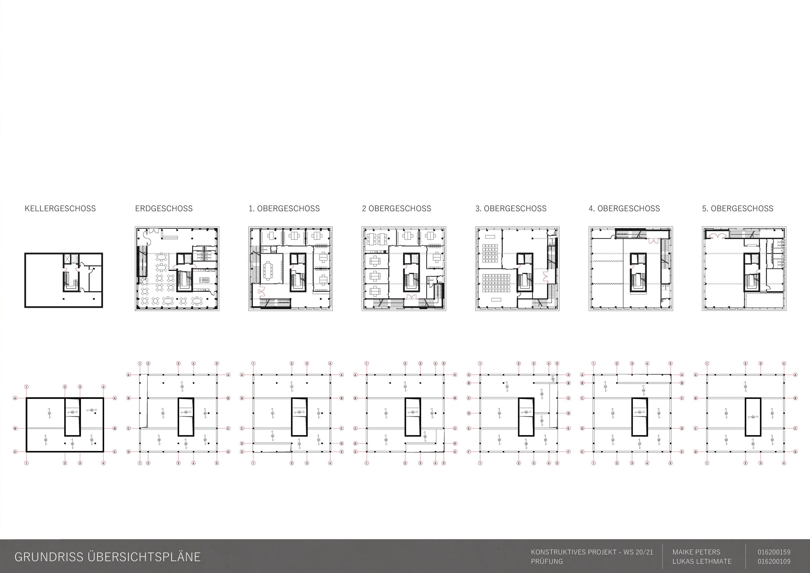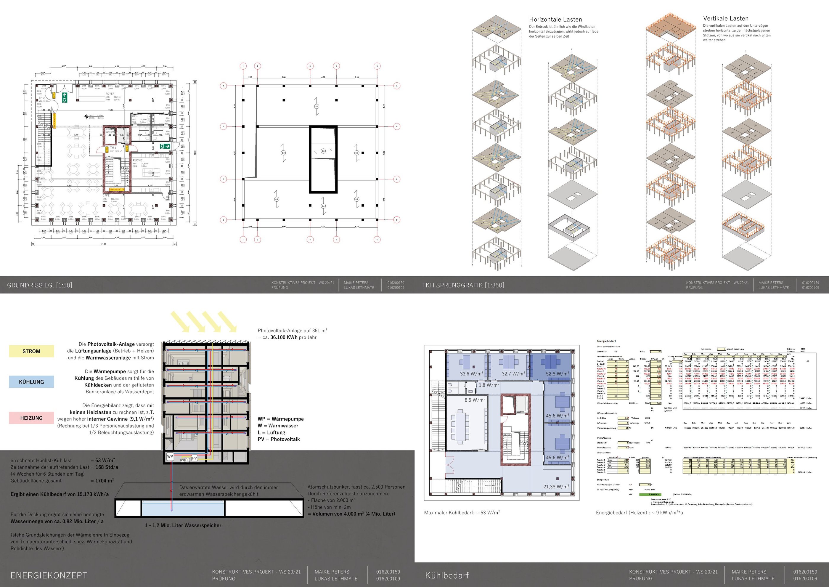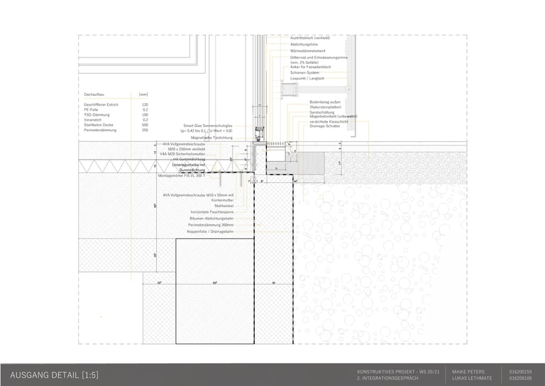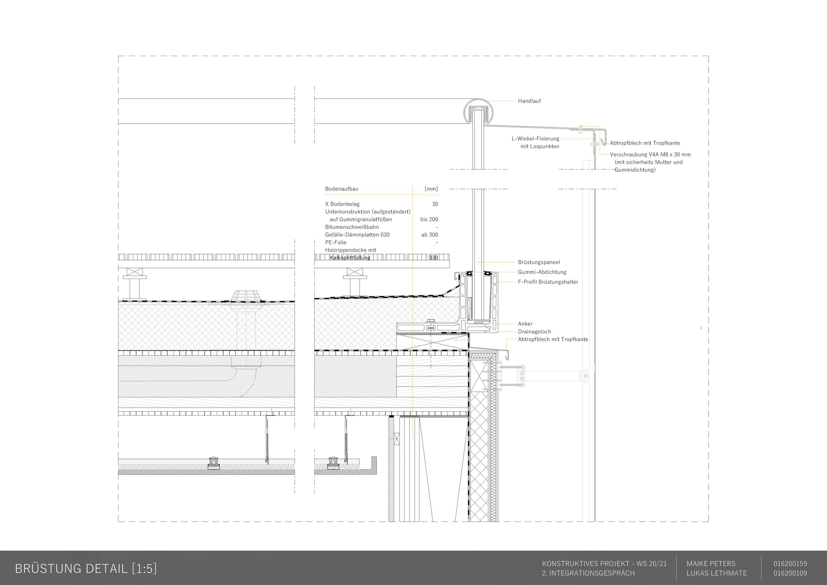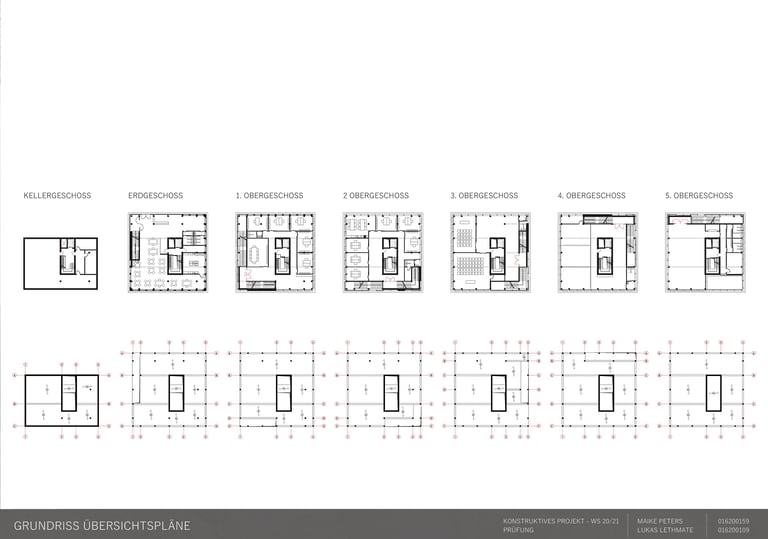 Die Aufgabe besteht darin, einen eigenen Entwurf oder wesentliche Teile davon bis zur Ausführungsreife und Detailplanung so praxisnah wie möglich auszuarbeiten. Mitbetreut wird das Projekt von den Lehrgebieten Tragwerkslehre und Baukonstruktion sowie den Lehrgebieten Technische Gebäudeausrüstung, Bauphysik, Baumanagement und Kosten im Hochbau. Auch diese Aufgabe wird in Zweierteams bearbeitet. Meine Gruppenpartnerin und ich entschieden uns für ein sechs geschossiges Hochhaus, das größtenteils aus dem Werkstoff Holz besteht und den Passivhausstandard erfüllt. Besonders wichtig war uns hierbei die weitreichende Vorfertigung im Werk unter idealen Bedingungen, um den Bauablauf zu erleichtern und zu beschleunigen. Die Fertigteile der Fassade, Treppen sowie Decken können auf der Baustelle über Steckverbindungen, die sich der klassischen Zimmermannskunst bedienen, gefügt werden. Lediglich der zentrale Fluchtkern ist aus Ortbeton gefertigt. Die Fassadenbekleidung besteht aus gelochten Messingblechen, die einen hohen Wiedererkennungswert aufweisen und zugleich Sonnenschutz gewährleisten sowie eine besondere Form der Transparenz erzeugen.